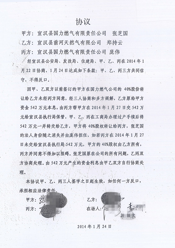 2013年,国力公司原股东、法定代表人张芝国因无力偿还向郑持云所借125万元建设的燃气管道,与郑持云签订了股权转让协议,将其持有的公司40%股权以232万元转让给郑持云。郑持云依约支付了款项,并代张芝国偿还了银行借款及相关费用310万元,累计支付了542万元作为股权转让对价。