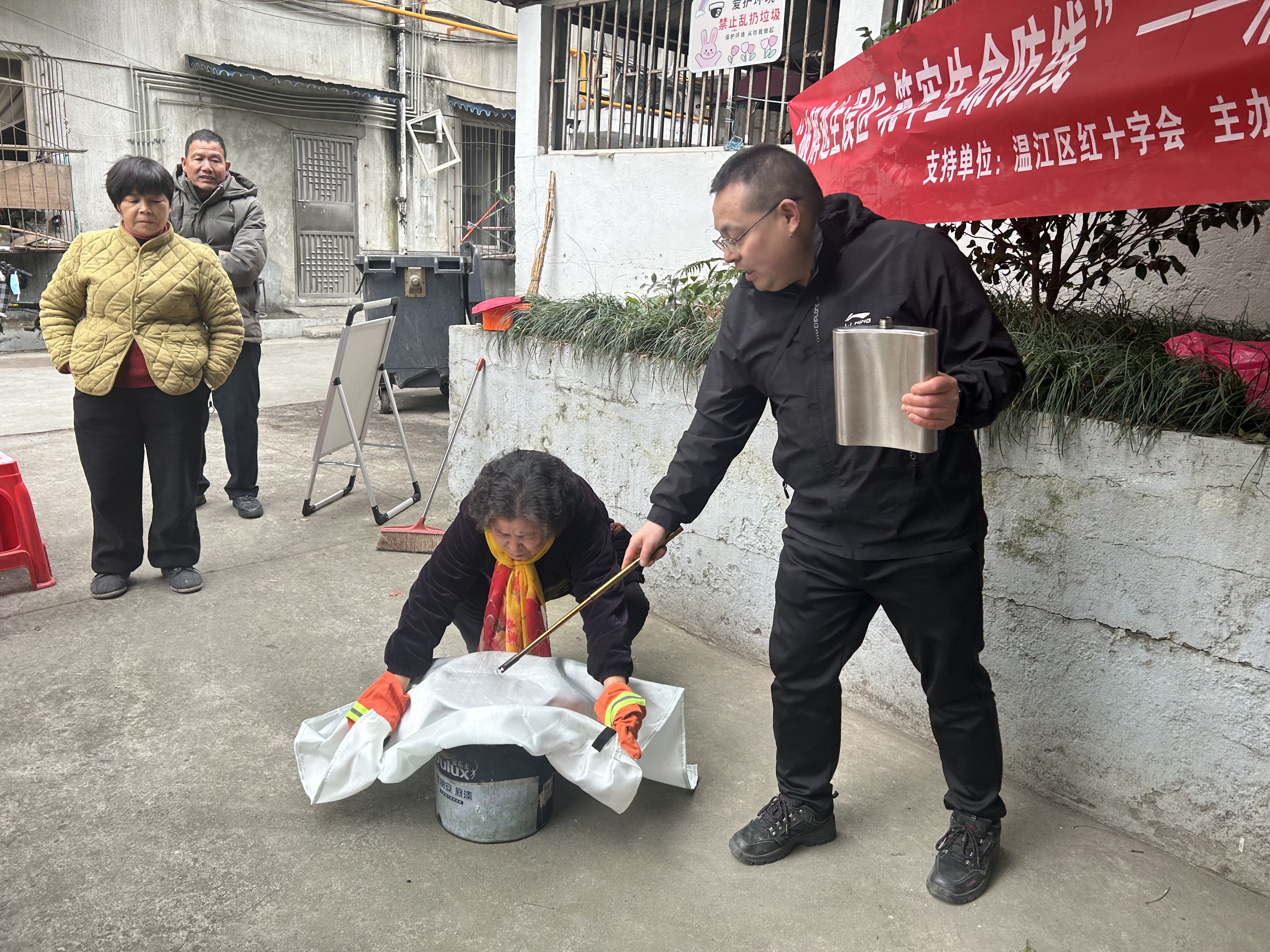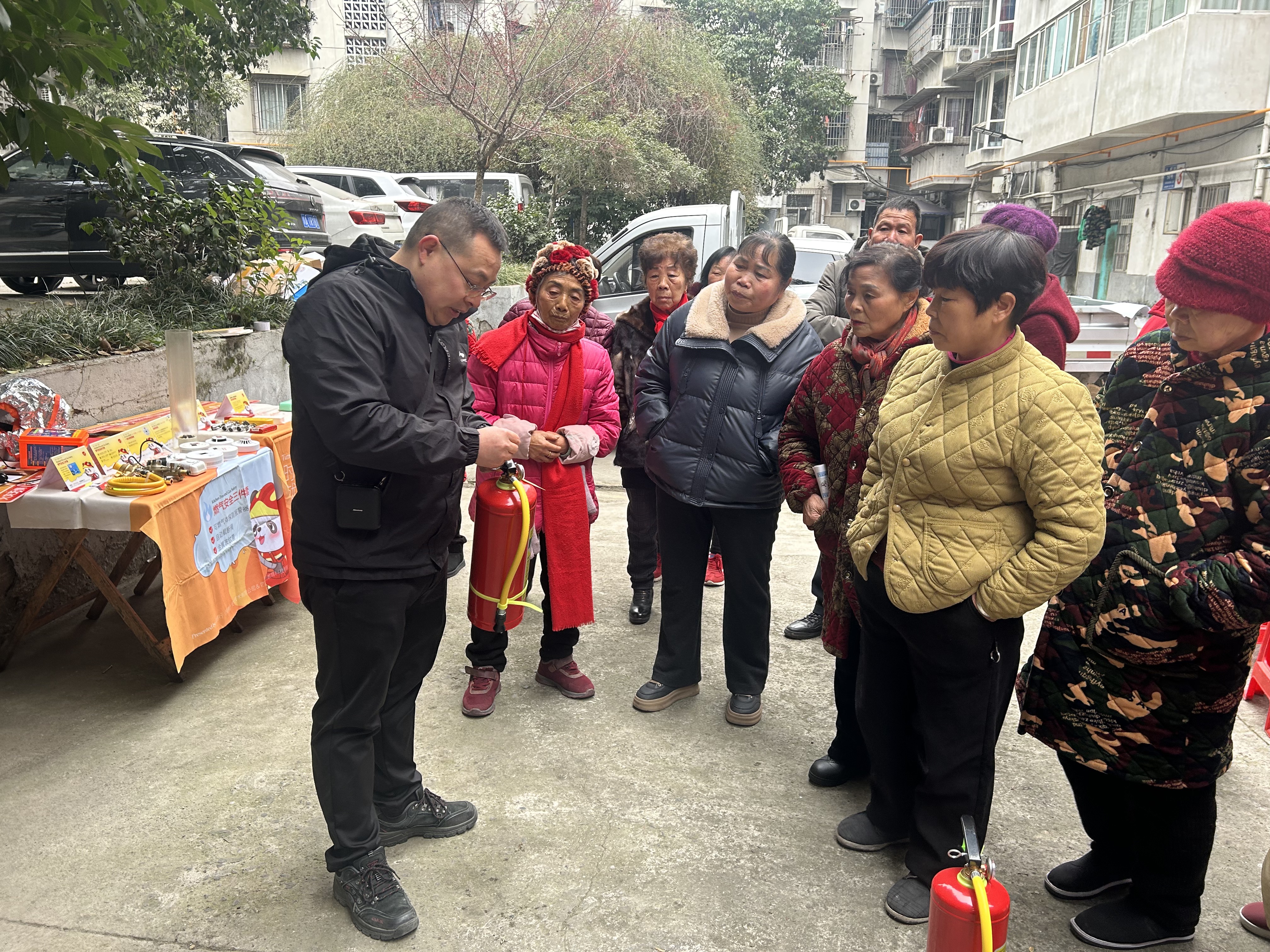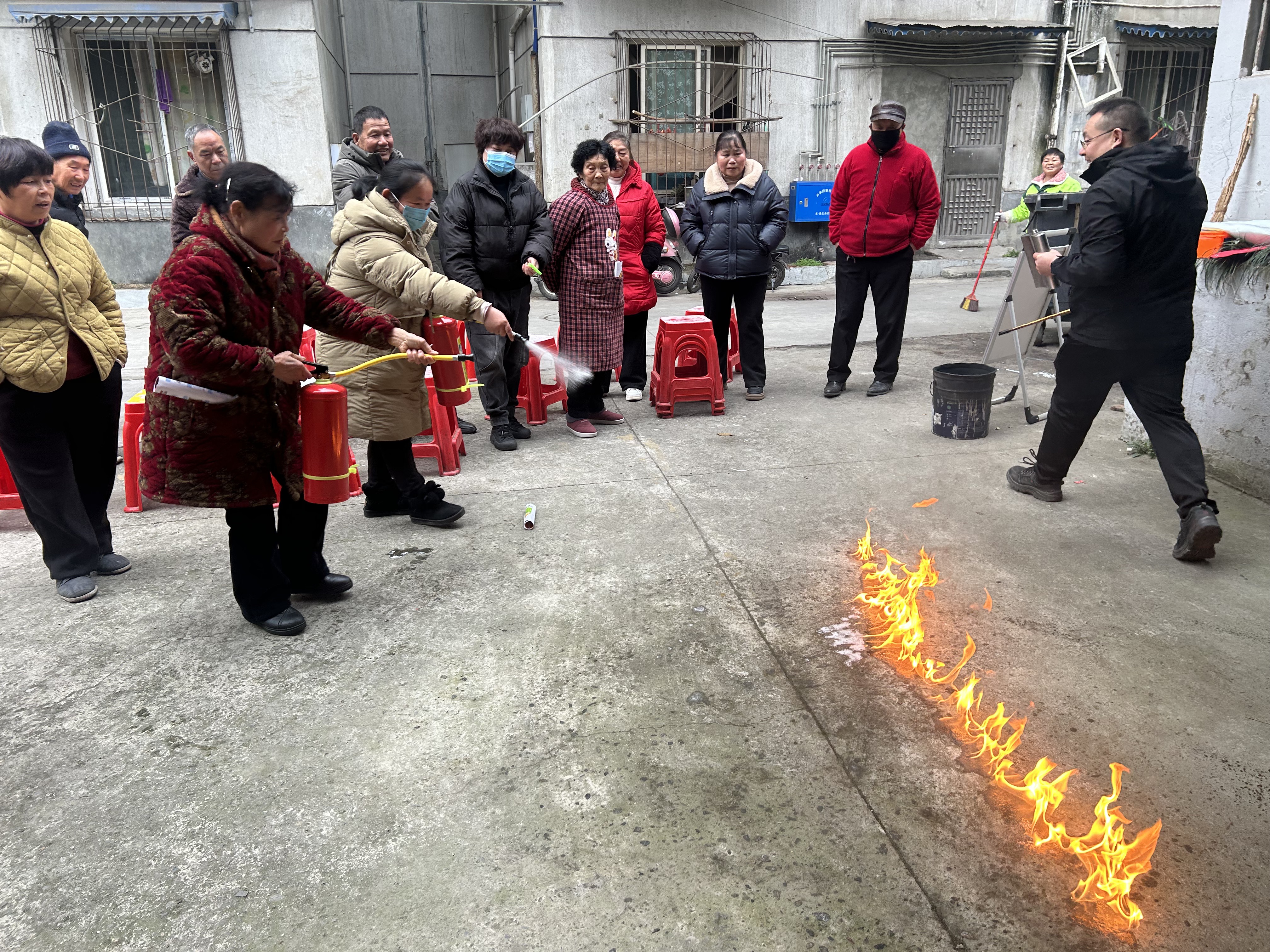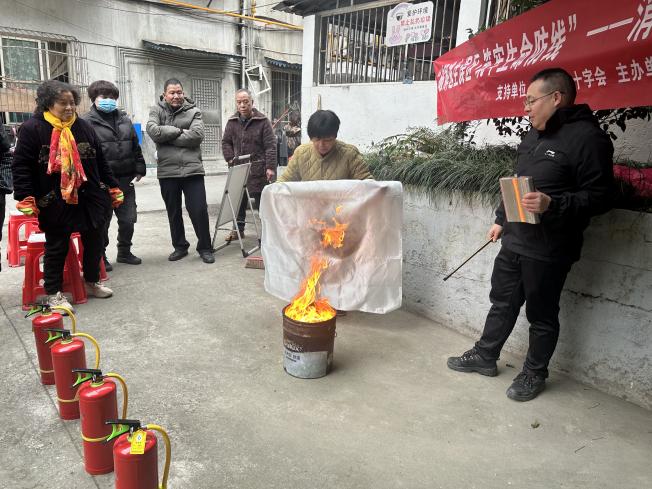 活动的户外实操环节将学习推向高潮。在专业指导下,小区居民们依次进行了过滤式消防防毒面罩的快速佩戴、灭火毯扑灭油锅火、以及使用灭火器扑救初期火灾等多项技能实训。通过亲身体验和反复练习,大家从“知道”到“会用”,切实掌握了基础消防器材的操作要领,克服了面对火情的恐惧心理。
