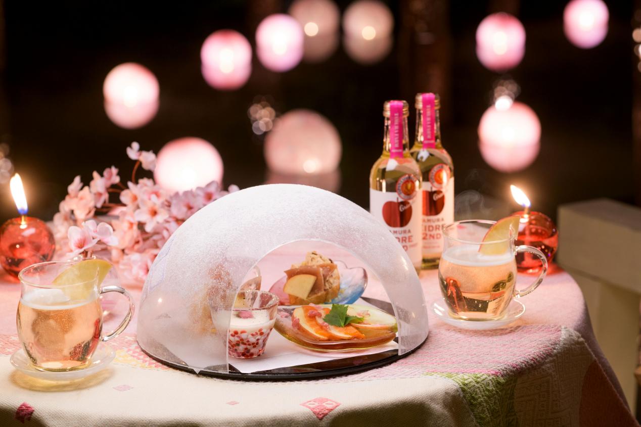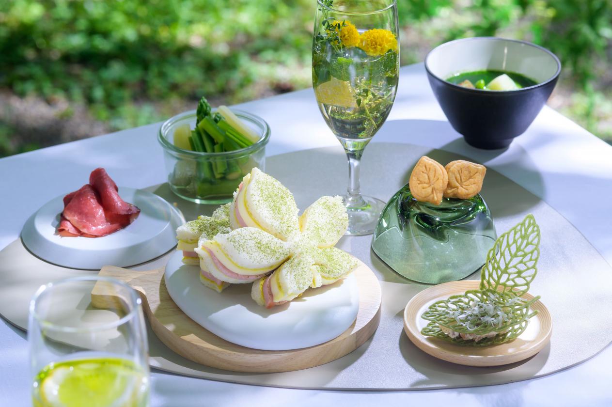 您将品尝到以苹果与生火腿、芝士制成的卡纳佩,以及苹果冷汤,所有小食均盛放在采用津轻玻璃制作的器皿中。器皿的色彩层次描绘了从雪融、萌芽到樱花绽放的春日更迭,让您在品味美食的同时,亦能从视觉上感受春之来临。