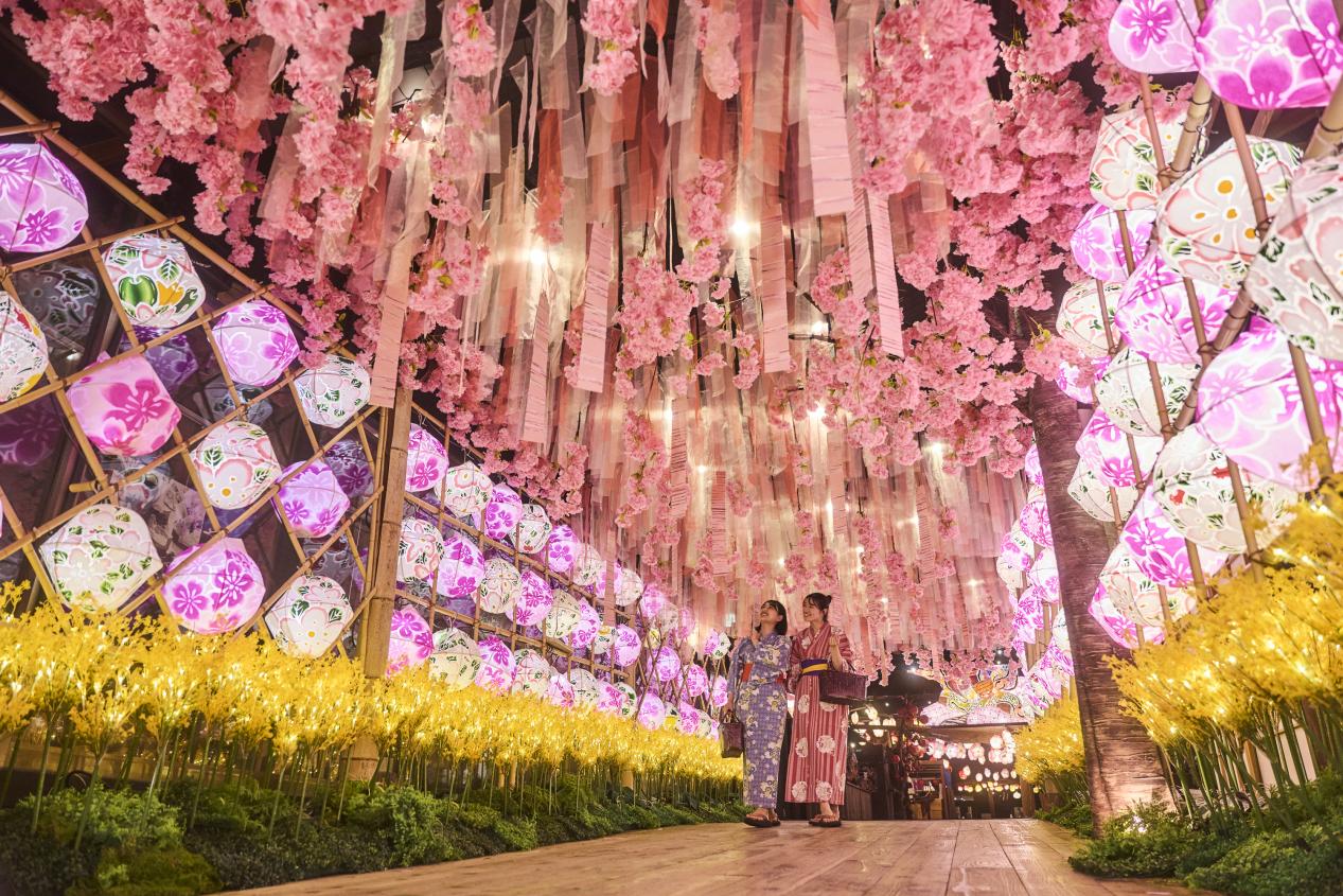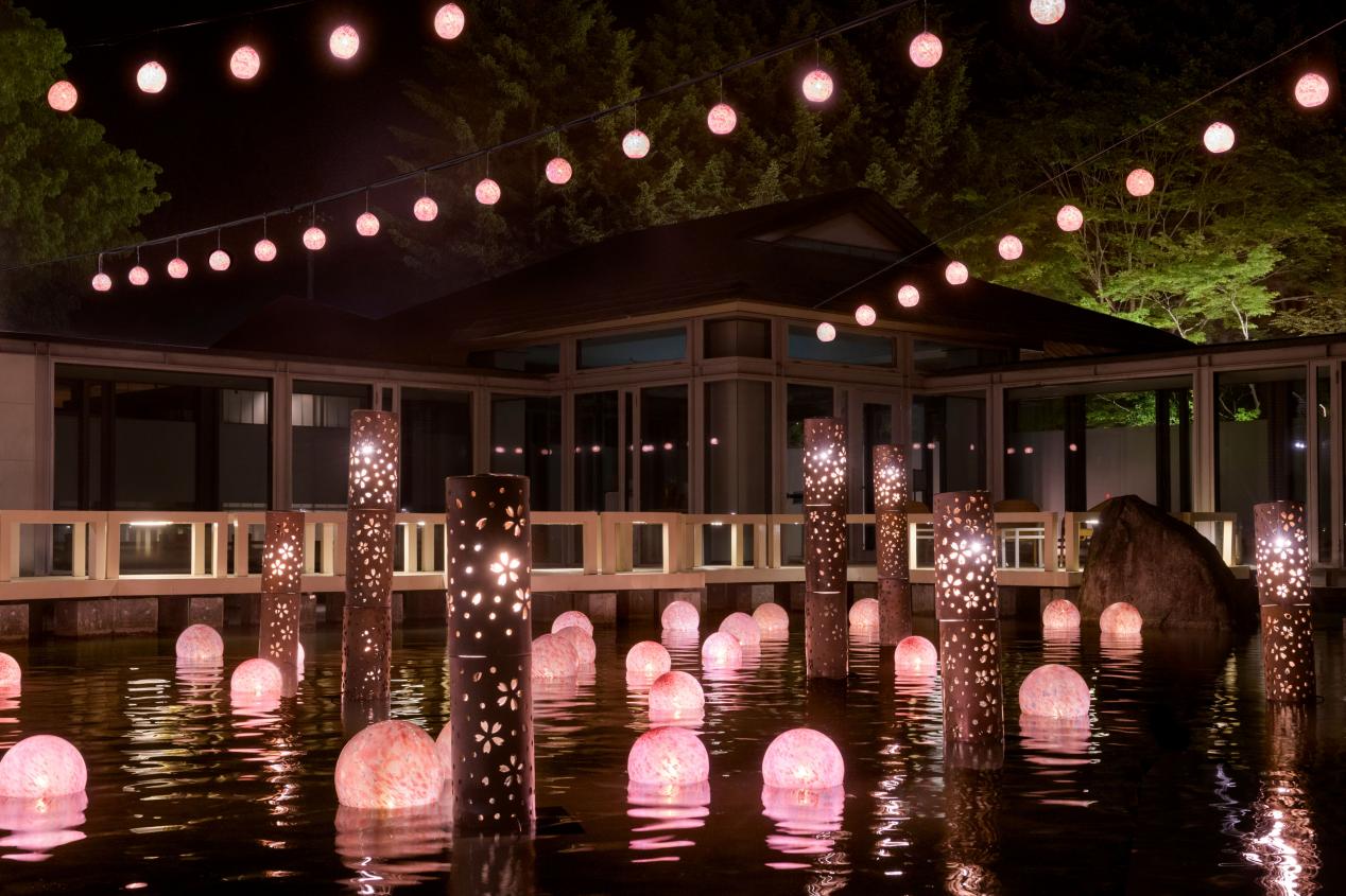 在露天浴池「浮汤」周围的池塘中,伫立着以睡魔技法制作的一棵盛开的樱花树,水面上漂浮着传统工艺品津轻玻璃的浮球。夜晚点亮灯火,可一边眺望梦幻景致,一边享受赏樱露天温泉之乐。