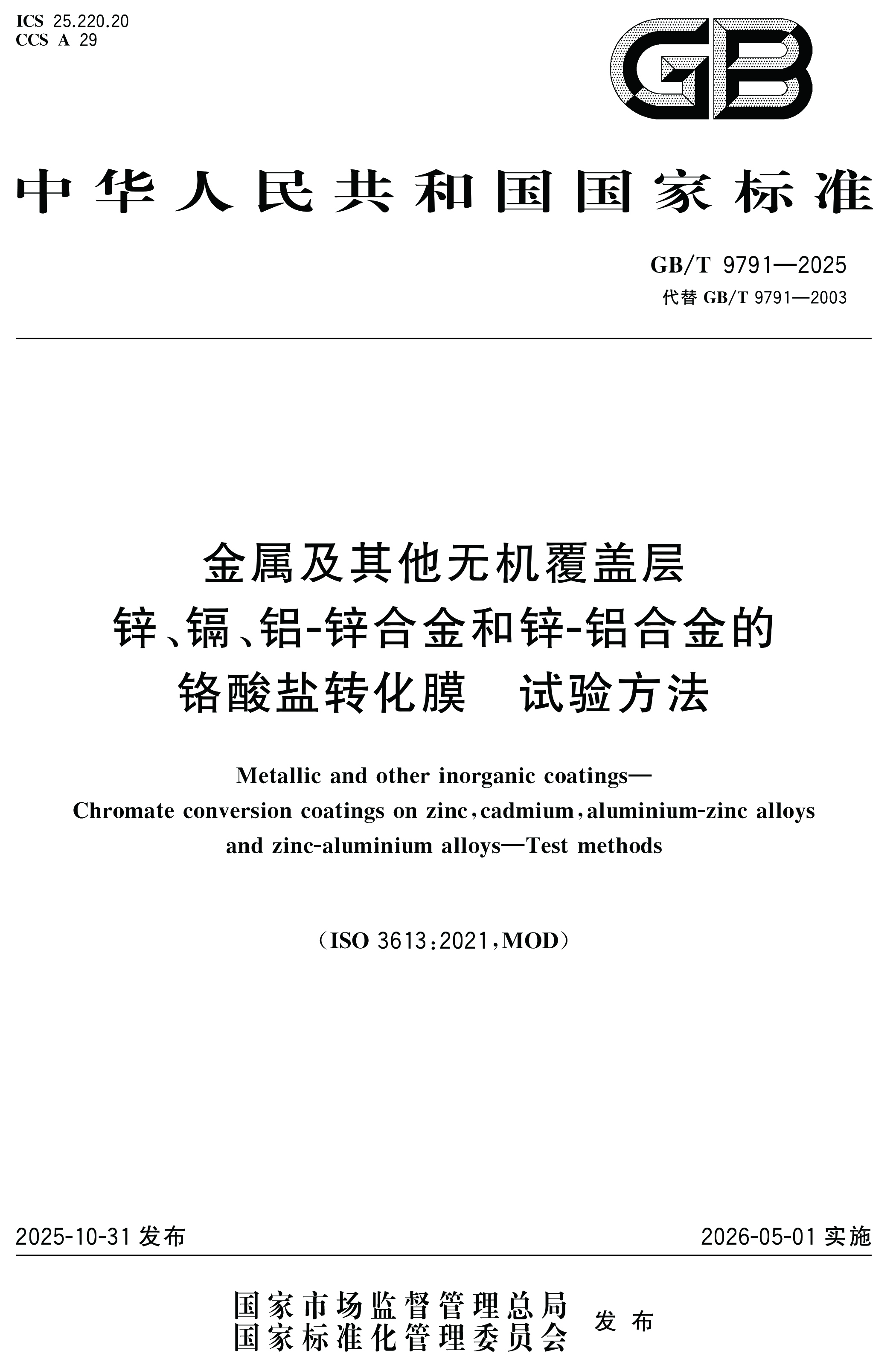 近日,由国家标准化管理委员会批准发布的《GB-T 9791-2025 金属及其他无机覆盖层锌、铝、锌
